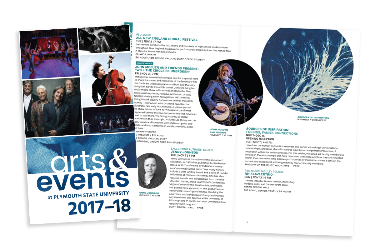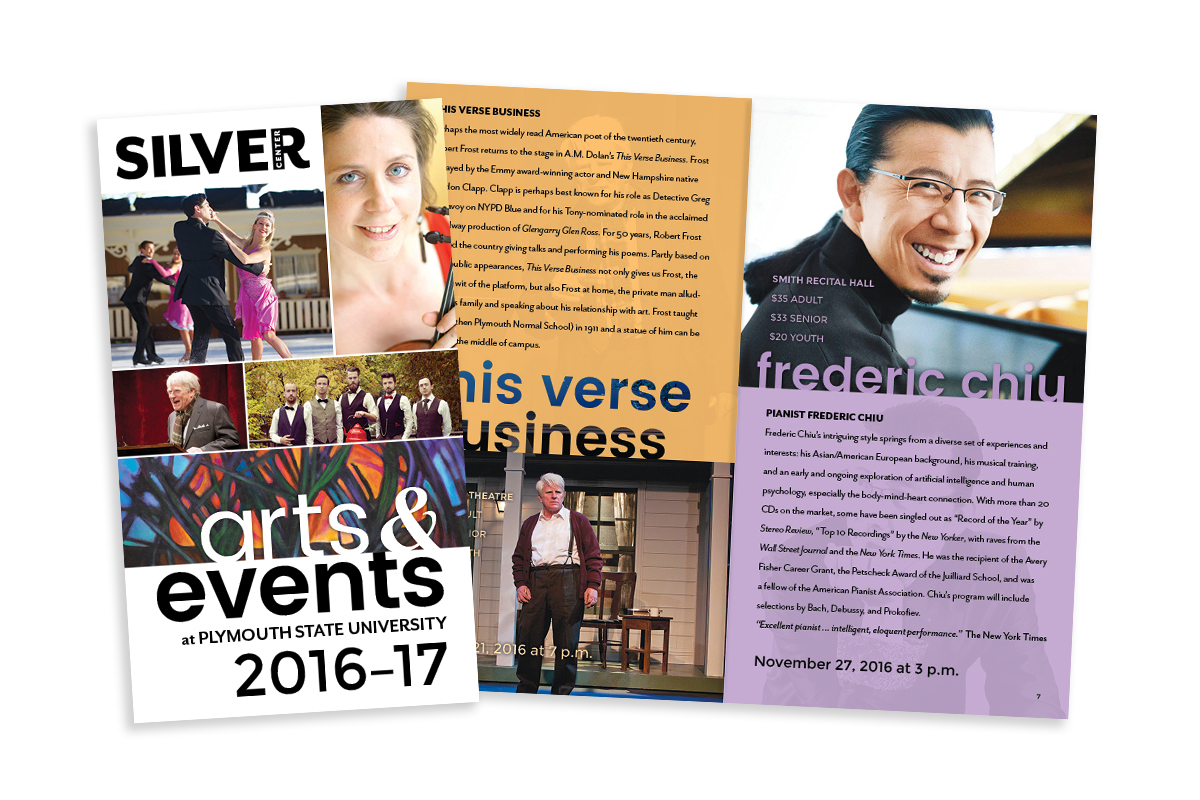 These brochures were designed for Plymouth State University's Silver Center for the Arts. They include information on the year's events along with art exhibitions in the many galleries at the university.