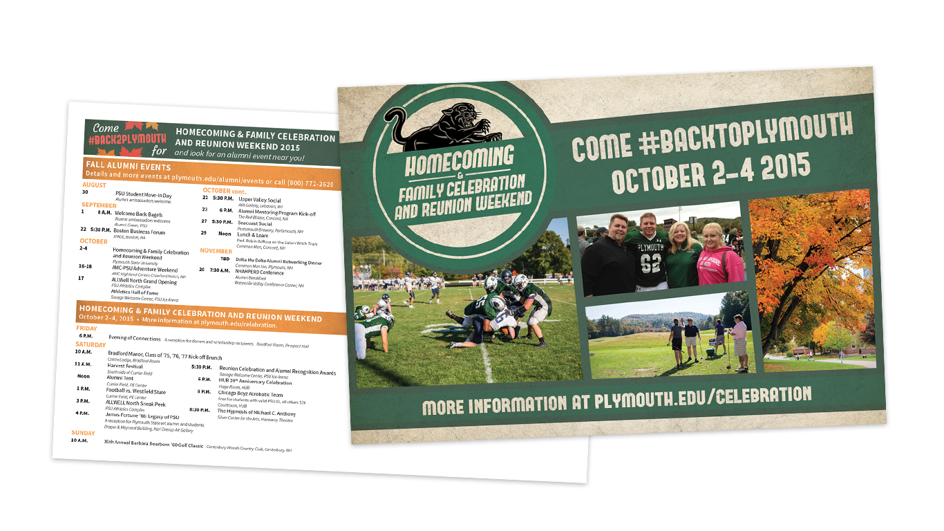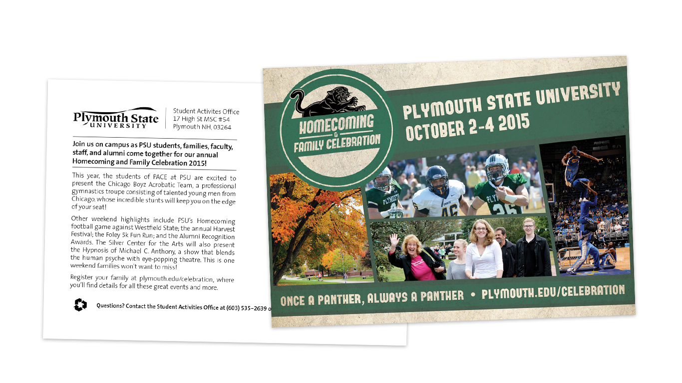 Postcard for Alumni and Student families for the 2015 Homecoming weekend.