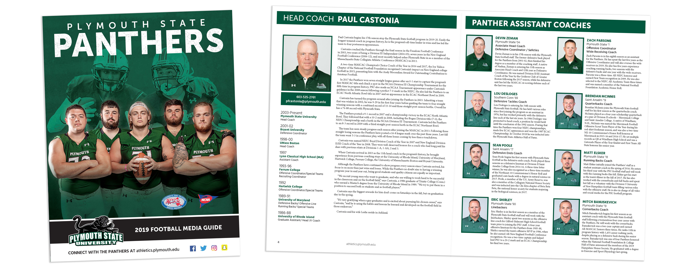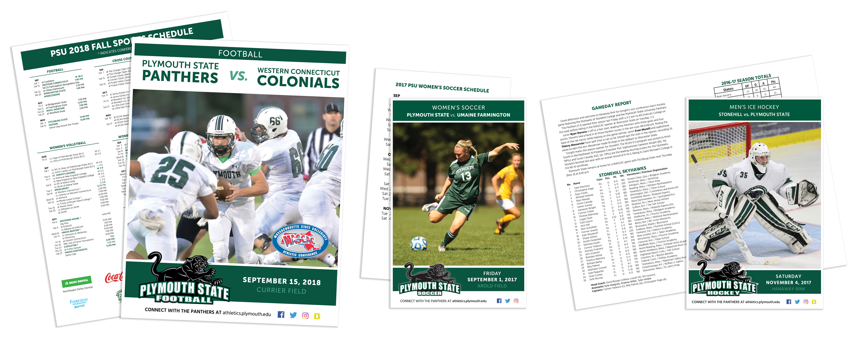 Gameday programs created for each sport. A basic template was created and then modified for each sport. Programs were printed in house on standard or tabloid sized paper.