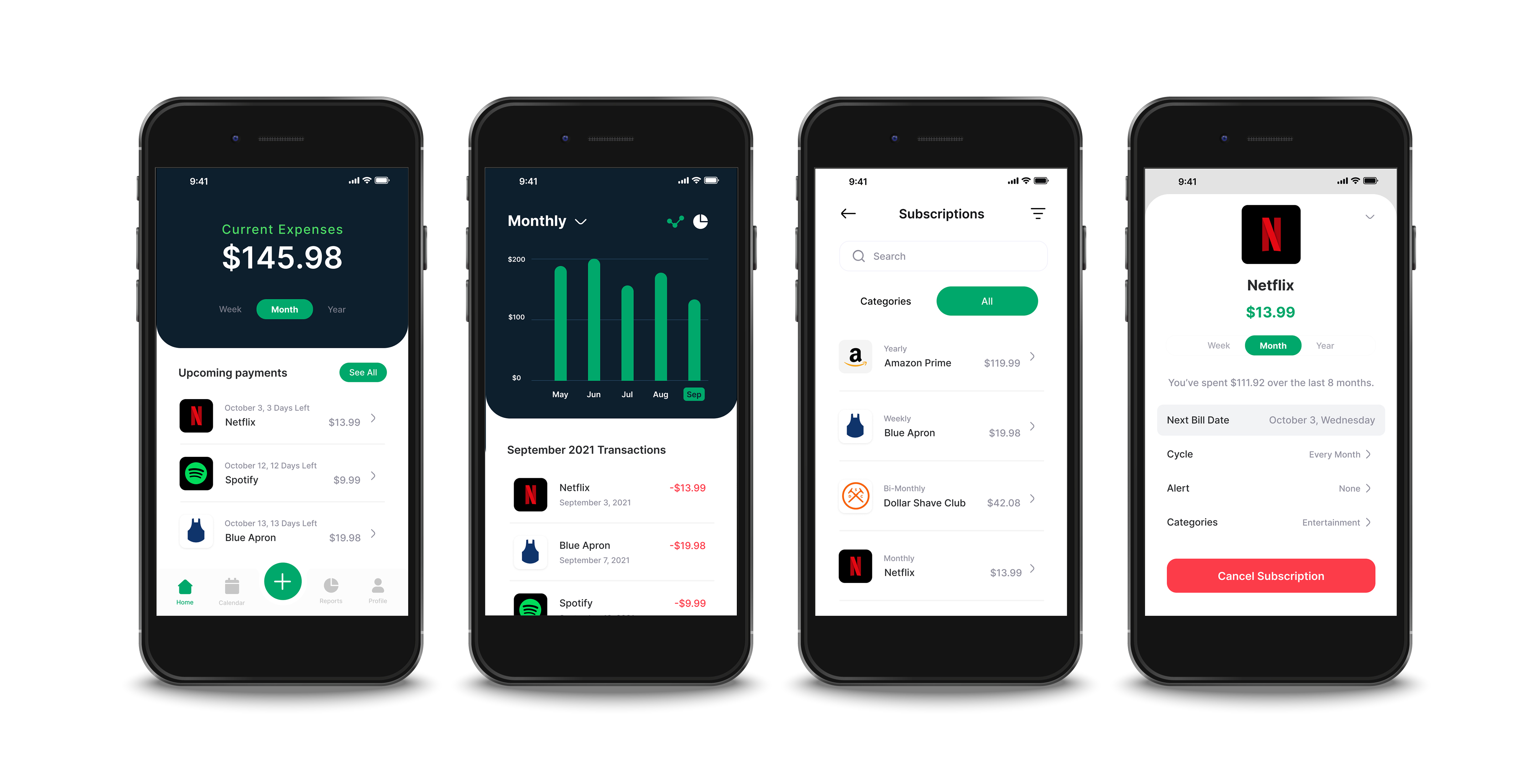 My goal would be to provide a much cleaner and easier-to-use experience. The general financial apps were much better designed but didn’t offer options to just review subscriptions. These apps also connected directly to the user’s bank account, something I wasn’t sure my users would like. TrueBill was the only app I tested that allowed users to cancel their subscription directly from the app. Since this was a requested feature for Sub-Track’s mobile app I took notes on how it was implemented.