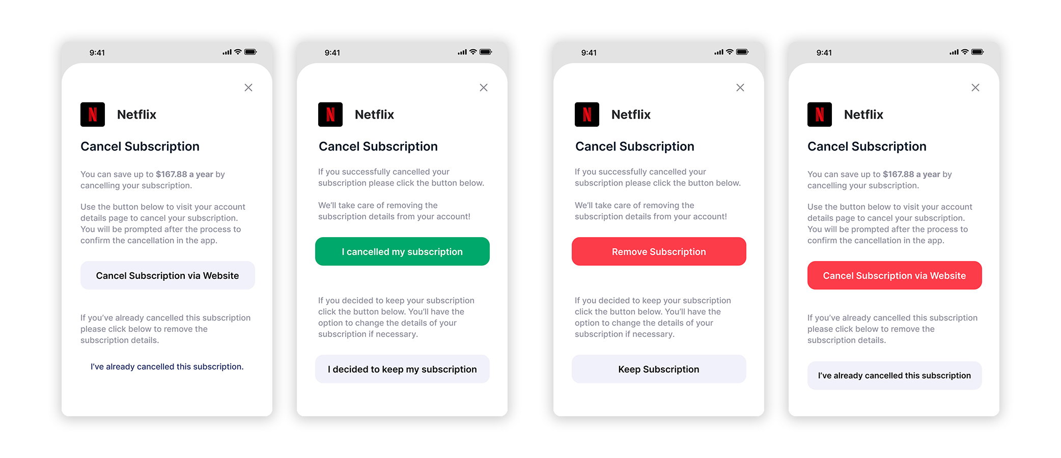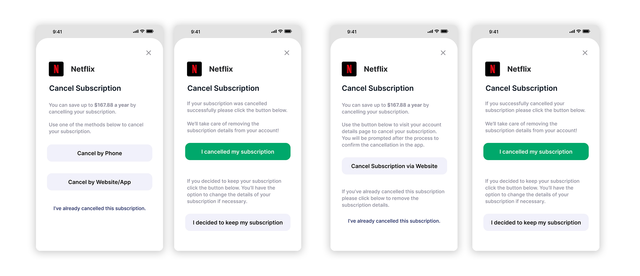 When designing the unsubscribe flow I realized that users would have to leave the app in order to complete this process. Since the final act of unsubscribing would be done outside of the app there would be no way to know if the user unsubscribed or not. Because of this, I added a confirmation screen upon return that would confirm a successful unsubscribe. Only then would the details be removed from the account.