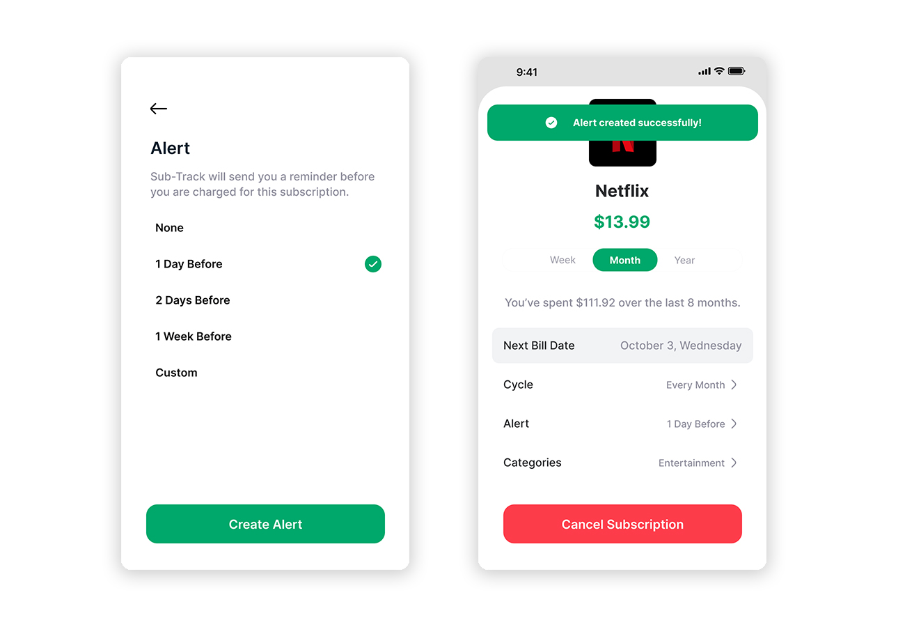 A green toast notification was added after creating an alert to give users another confirmation. A custom alert option was then added to the alert creation screen, users would have the ability to set a specific date and time for the alert.