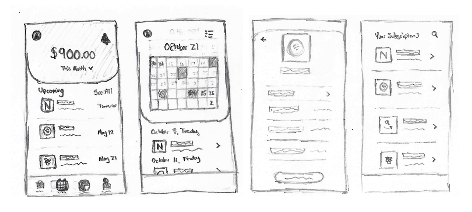 I then sketched out preliminary designs of the main screens. The plan was for the main screens of the app to mimic those in the desktop version with some slight changes for the homepage which would focus on upcoming subscription payments with the option to view the full list.