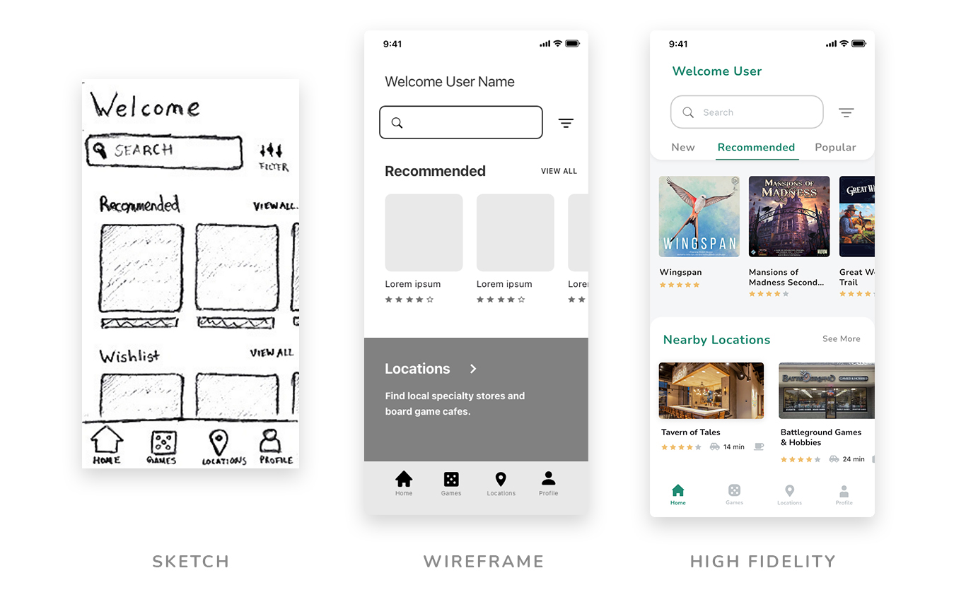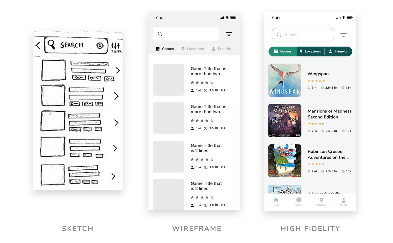 When translating my wireframes to high fidelity I made changes to the structure of multiple pages to keep a consistent look across the app. I originally set up a tab system on the search page based on a wireframe kit. However, I found the system fit on multiple pages and would reduce vertical scrolling to access certain categories. This also made the design of the home page and game page more distinct. I built a tray system to add a sense of depth to the design and to keep the placement of elements consistent.
