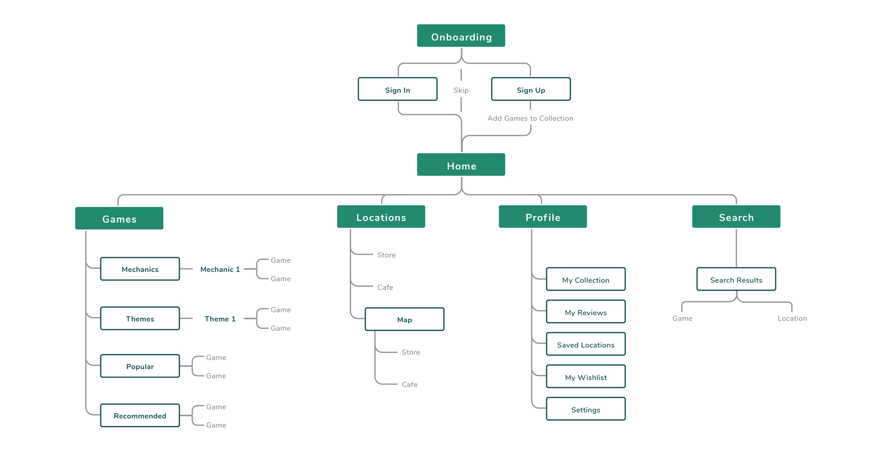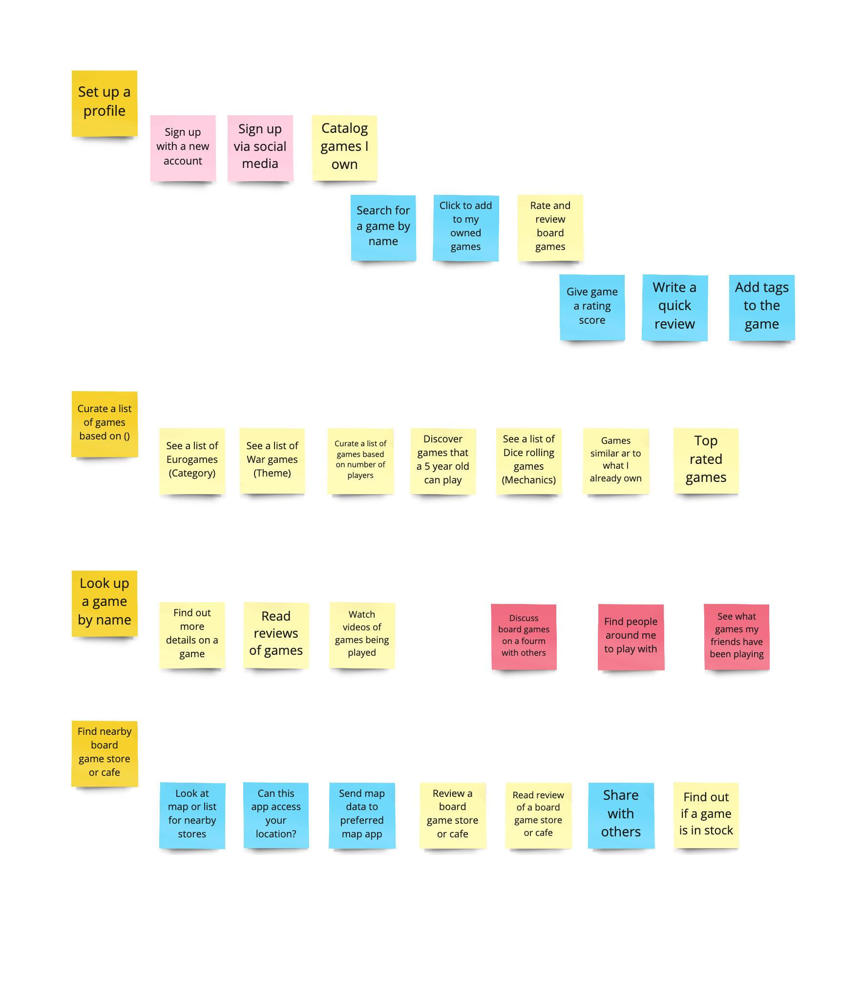 Beginning with some background and user research I was able to interview five potential users of this app. Participants were asked about their previous experience buying tabletop games, any current tools they use to assist, familiarity with board game cafes and stores, and features they look for in an app. I was able to synthesize this research into a few main categories using an affinity map.