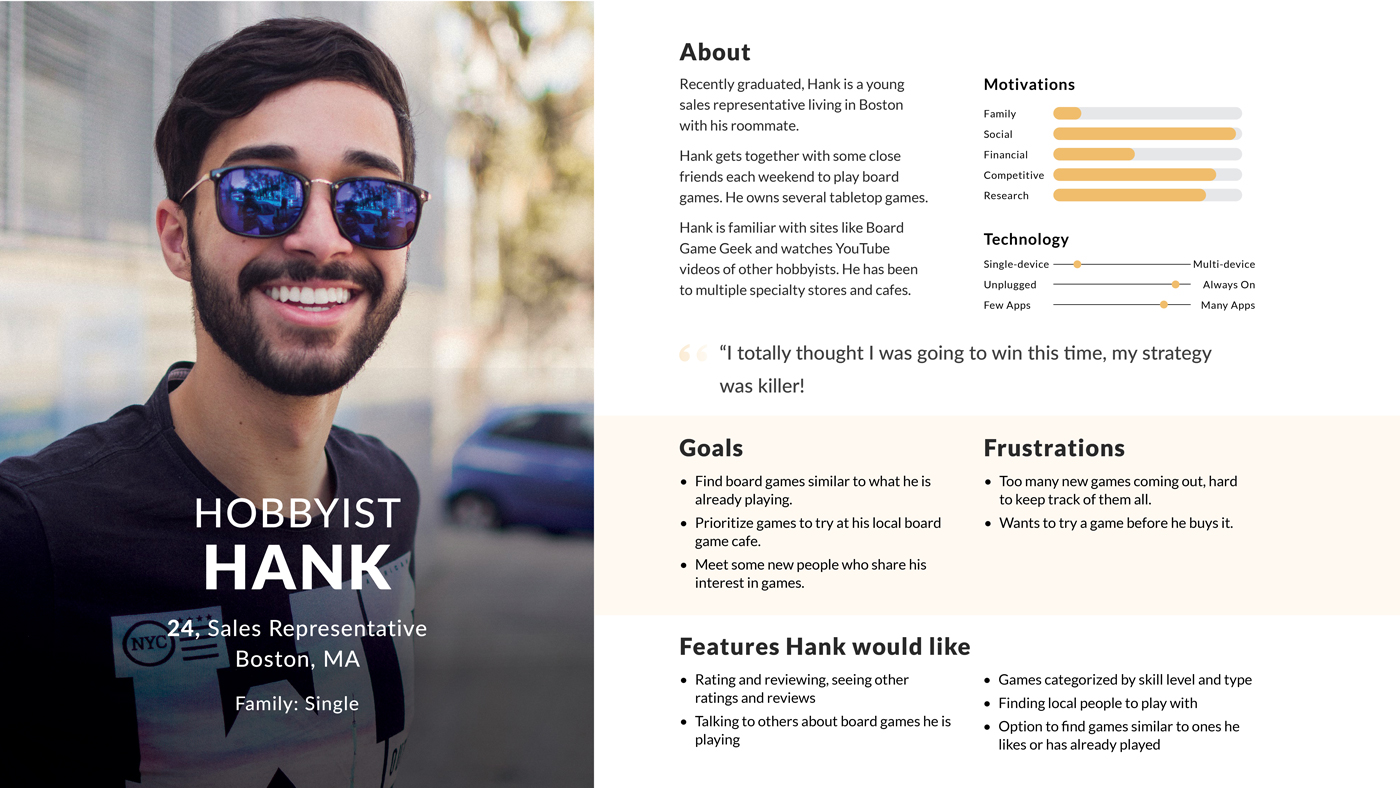 As a tabletop player who has given personal recommendations to others, I wanted to find a way to guide people to board games that fit their playstyle. Over three months I built a solution using the five-step design methodology, empathize, define, ideate, prototype, and test. This solution, Tabletop Detective, is designed to help users easily find tabletop games that fit their playstyles and places to try or buy them.